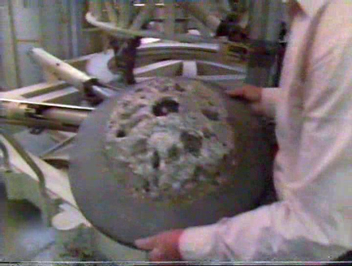 In this photo Mishin is showing the bottom of the same foot which was later altered to remove this pattern on the bottom. Is this the cellular shock absorber? Is this how it would have appeared when landing on the moon? And if so, does anyone know how such a pattern was achieved?
