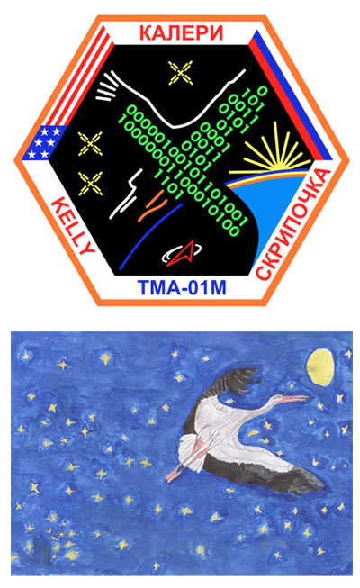 По-моему, традиция делать эмблемы из детских рисунков весьма позитивна. Просто в последнее время то ли поток рисунков иссяк, то ли дети совсем слабо представляют, что можно нарисовать на космическую тему...  :(  Короче, эмблема ТМА-М выполнена голландскими художниками по мотивам вот этого рисунка.