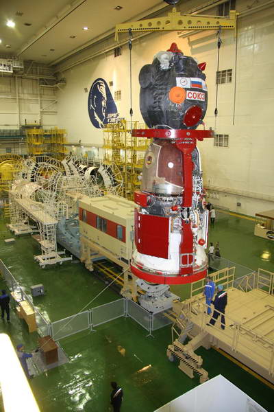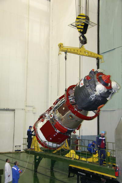 Сегодня утром в монтажно-испытательном корпусе площадки №254 космодрома расчеты РКК «Энергия» имени С.П.Королева, «ЦСКБ-Прогресс» и филиала ФГУП ЦЭНКИ – Космического центра «Южный» приступили к сборке космической головной части – пилотируемый космический корабль «Союз ТМА-М» был установлен на переходной отсек – блок, соединяющий его с ракетой-носителем. Следующим этапом  работ станет авторский осмотр, а завершится сборка космической головной части «накаткой» на пилотируемый корабль головного обтекателя. После этого пройдет вторая тренировка космонавтов, а затем головную часть перевезут на площадку №112 космодрома для общей сборки с ракетой-носителем.
