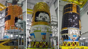 (Left) All HTV2 modules are being connected (Center) Integrated HTV2 (front side) (Right) Integrated HTV2 (back side) (Images by JAXA)
