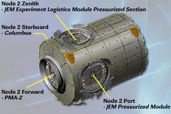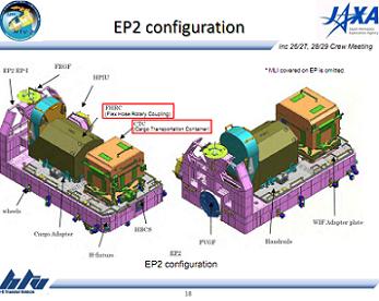 In the days following the HTV-2 berthing, the ORU-laden EP will be extracted from HTV-22s ULC with the SSRMS, and attached to the Japanese Exposed Facility (JEF) on the Port side of the station. Following the completion of this procedure, the SSRMS will un-berth HTV-2 from the Node 2 Nadir port, and transfer it to the Node 2 Zenith port directly above the Nadir port.
