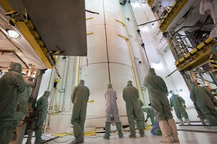 ЦитироватьOn Launch Pad 39A at NASA's Kennedy Space Center in Florida, technicians prepare to close the clamshell doors of space shuttle Discovery's payload bay in preparation for the STS-133 launch to the International Space Station.