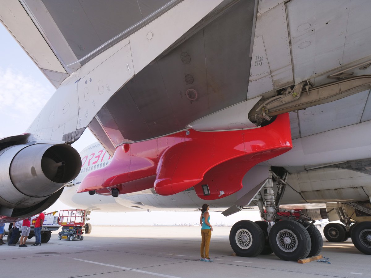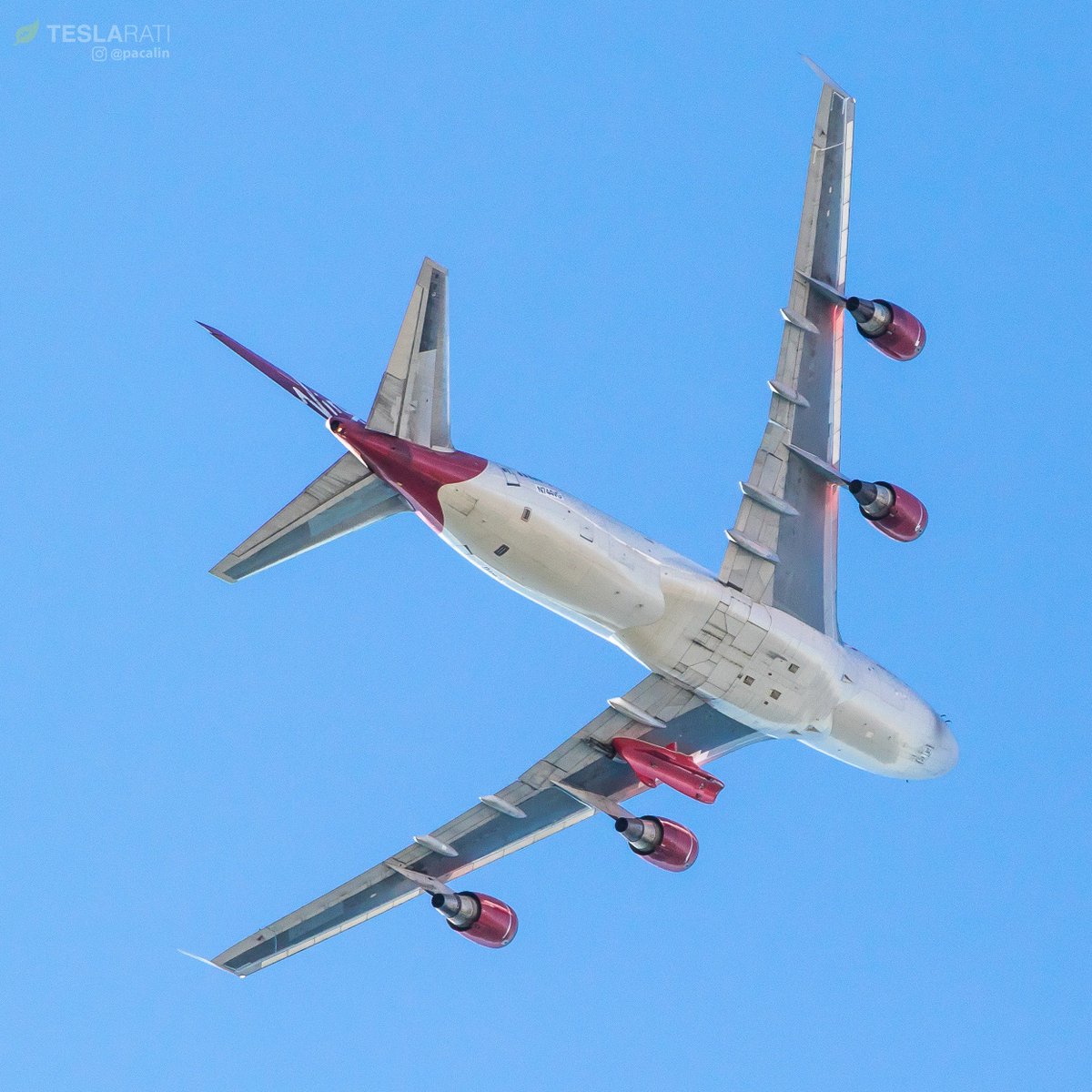 Cosmic Girl exposed her underbelly today at #greatpacificairshow2018 revealing a perfect view of the pylon under her left wing. It's going to be insane to see a rocket attached to that thing. @Virgin_Orbit @Teslarati