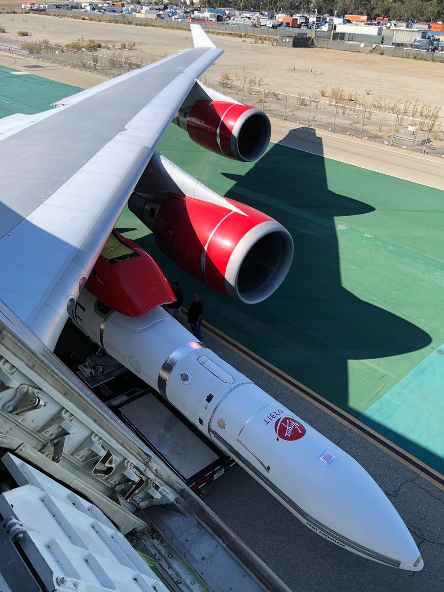 Capping off a great day of firsts, we mated our #LauncherOne rocket to #CosmicGirl, our customized 747, as the sun set over the beautiful @LBAirport. An excellent way to cap off a smooth and successful day! – Virgin Orbit