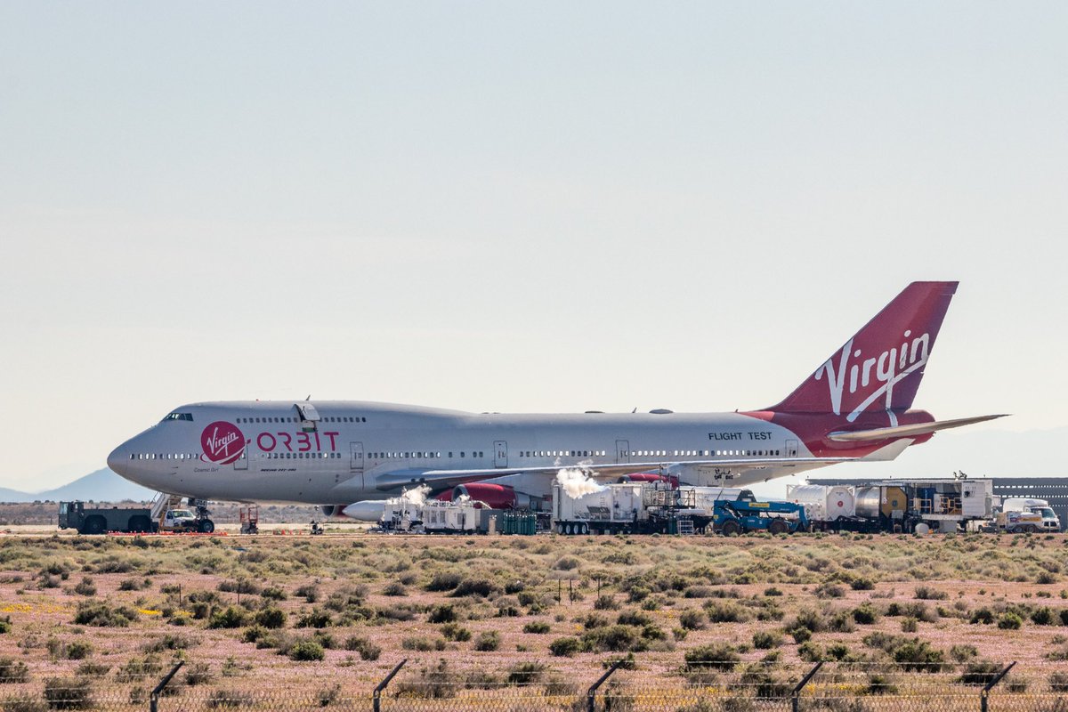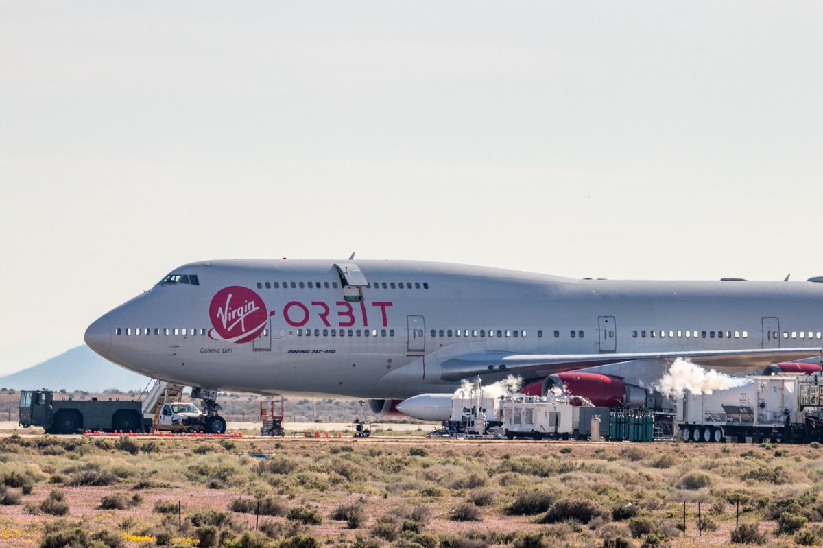 Good morning from Mojave Air and Space Port! You're looking at @Virgin_Orbit's 747 Cosmic Girl, with what appears to be a fueled or fueling Launcher One rocket slung under the wing. The plan today is likely to fuel the rocket and then conduct a short test flight. @NASASpaceflight