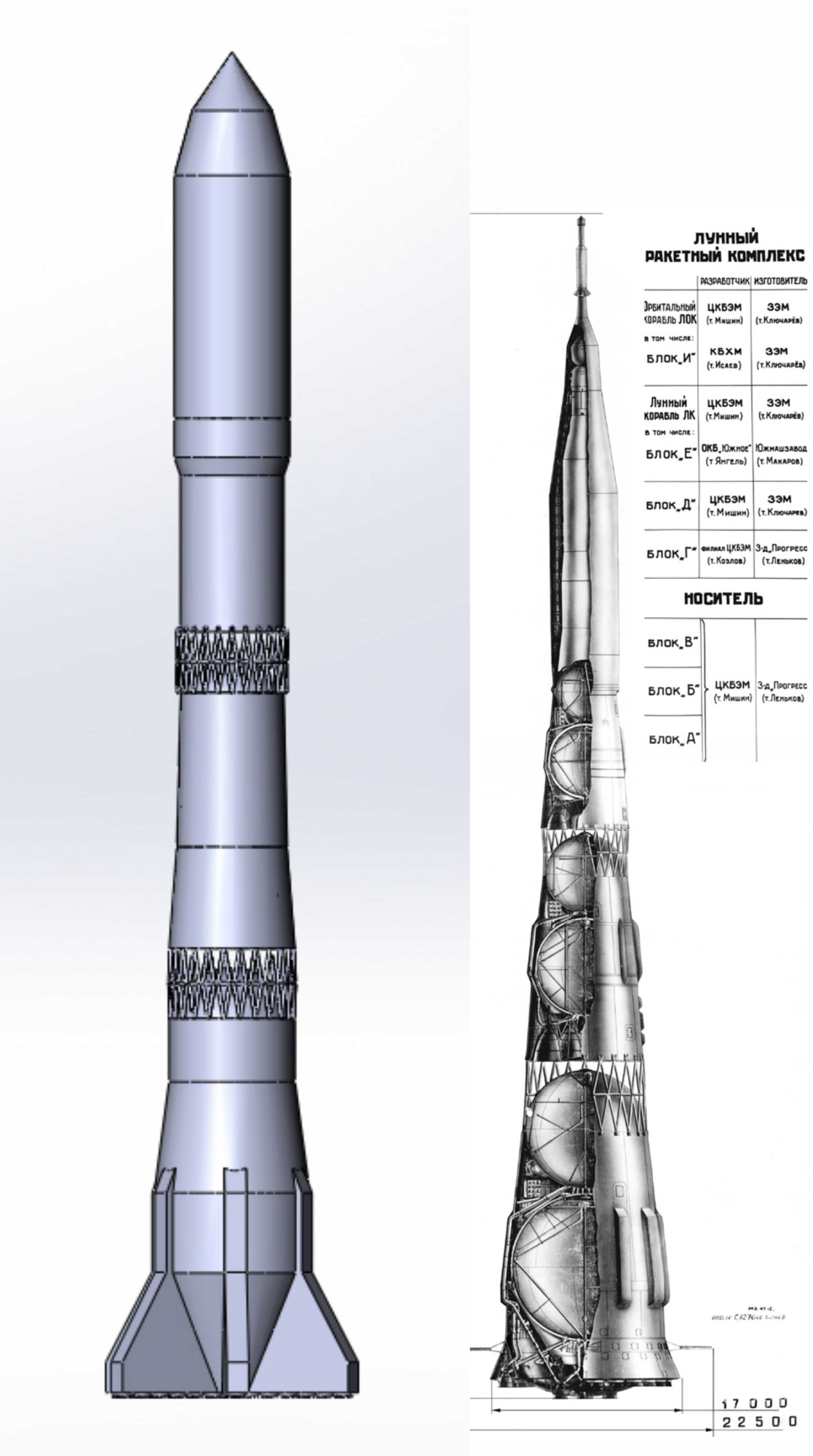 Но длинна выходит под 150 метров. Диаметр понизу 22 500 мм и на стартовый стол Н-1 это точно не встанет. Наверно и транспортный агрегат новый нужен.