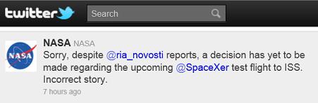 NASA knocked down the report in a Tweet today, saying no decision had been made. SpaceX spokeswoman Kirstin Brost Grantham confirmed NASA's statement in an e-mail to Parabolic Arc.