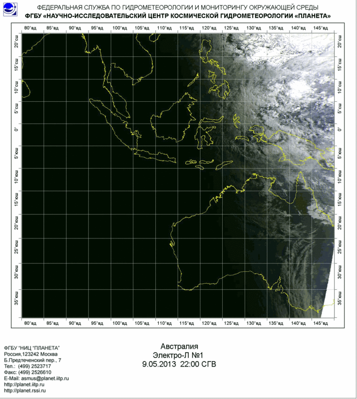 Метеорологический спутник «Электро-Л» был создан по заказу Роскосмоса и Росгидромета в НПО имени Лавочкина и предназначен для мониторинга состояния атмосферы. Аппарат находится на геостационарной орбите над территорией Индийского океана на высоте около 36 тысяч километров. Каждые 30 минут спутник получает снимки Земли с разрешением до 1 километра, которые выкладываются в исходном виде на сайте НЦ ОМЗ. В будущем Роскосмос планирует увеличить число спутников этого проекта на орбите до трех аппаратов.