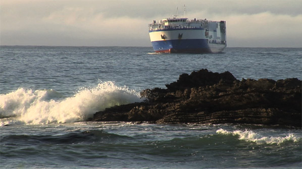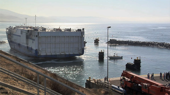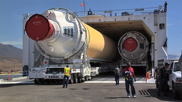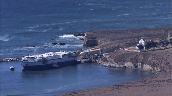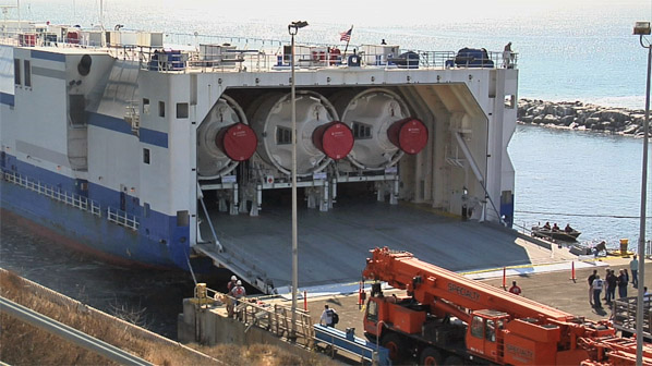 The three Common Booster Cores and the cryogenic upper stage to comprise the West Coast's first Delta 4-Heavy rocket arrives aboard the Delta Mariner shipping vessel at Vandenberg Air Force Base's harbor in September 2009 after a month-long, 4,000-mile voyage from the factory in Alabama, including a trip through the Panama Canal. The rocket segments were transported up the road to Space Launch Complex 6 and the Horizontal Integration Facility for assembly.