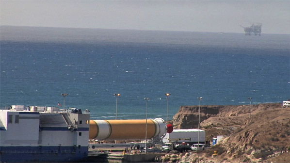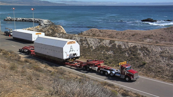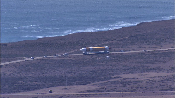 After arriving late-September 2009 at the harbor once envisioned for receiving the space shuttle fuel tank barge, the first West Coast Heavy rolled onto California soil and moved up the road to SLC-6 over a three-day period.