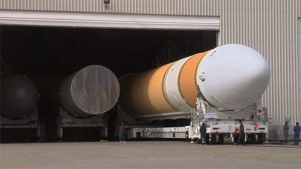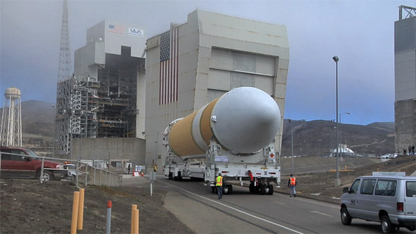 The Delta 4-Heavy rolls to the SLC-6 pad in January 2010. Credit: ULA video