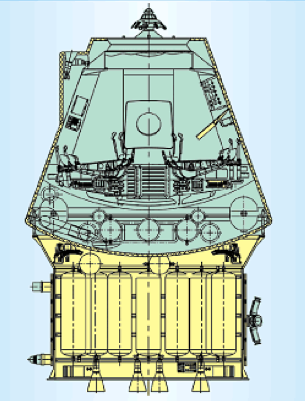 Первоначально рисовалась группа индивидуальных РДТТ с соплами в донном экране. Затем появилась система с соплами в стенках агрегатного отсека и с питанием от центрального твердотопливного двигателя (или двух) и регулированием тяги. Как собирались управлять посадкой на раннем этапе - поворотом индивидуальных «горшков» или их сопел, не совсем понятно. Но это сейчас чисто исторический вопрос.