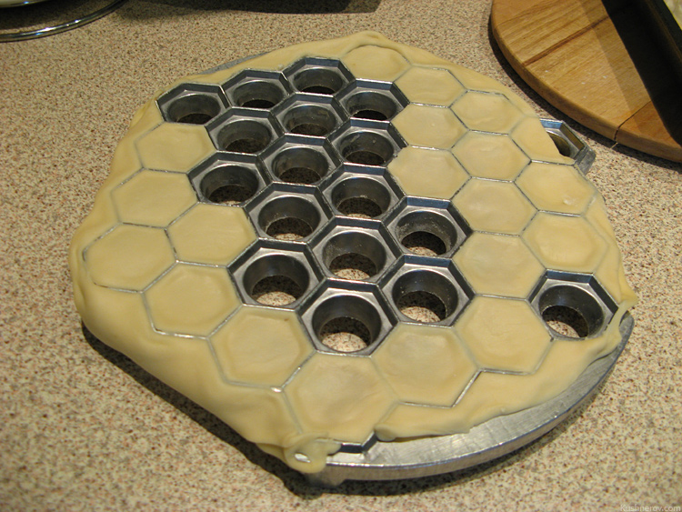 У родственников была приспособа из дюраля с шестиугольными отверстиями для лепки пельменей. Одна была из порошка. Типа такой: