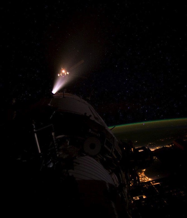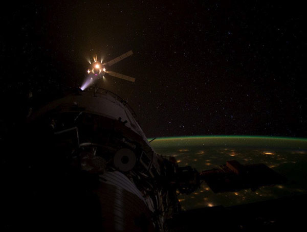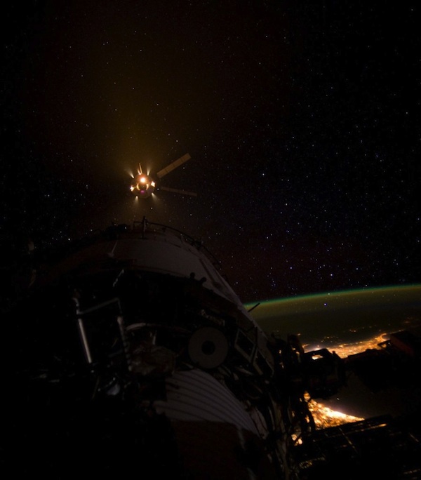 Spectacular photos: Europe's #ATV3 cargo craft lurks in the night before docking with the space station. http://bit.ly/HuZii0