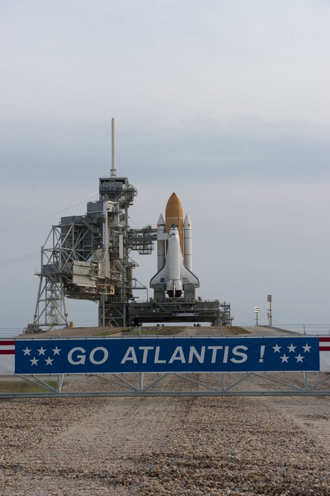 Накануне вечером специальная многотонная подвижная платформа со скоростью около 5 км/час доставила космический челнок к месту запуска. За трансфером "Атнлантиса" и его установкой наблюдали около тысячи работников НАСА, а кроме того сюда были приглашены члены их семей.
