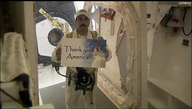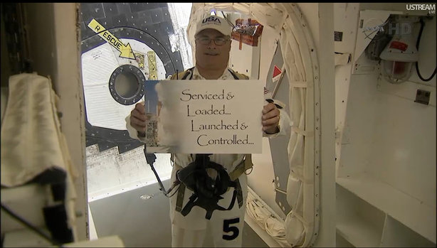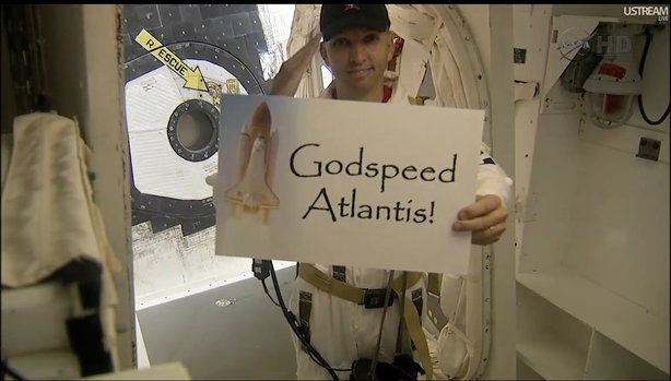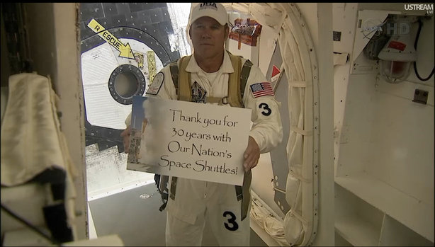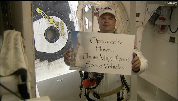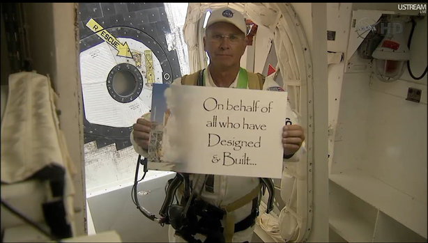 The Closeout Crew sends its farewell and thanks after helping the final space shuttle crew into their seats before liftoff.