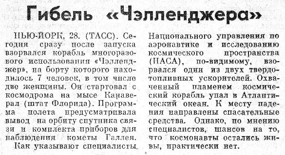 Не совсем верно.Помню, что впервые о катастрофе услышал в прогамме новостей по телевизору, если не ошибаюсь в 15 минутных новостях Вестей. И коментатор сообщил о гибели астронавтов со злорадством. Правда, это был его последний эфир- после подобной выходки,он был отстранён от работы.