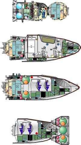 Ещё - кресла при старте можно разместить и поперёк корабля. Тогда после срабатывании САС их можно крутануть вокруг оси для соответствия направлению перегрузки. Садится лёжа поперёк конечно  будет не слишком удобно, но это же аварийный вариант...