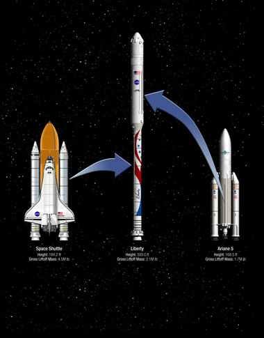 The Liberty rocket would blast off from Kennedy Space Center on 3.1 million pounds of thrust from ATK's Ares solid rocket, then the Ariane's hydrogen-fueled Vulcain 2 engine would ignite to accelerate crews into low Earth orbit.