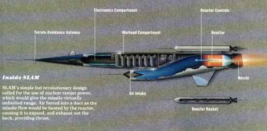 ЦитироватьВ 50-х годах мечта о всесильной атомной энергии (атомных автомобилях, самолётах, космических кораблях, атомном всё и вся) уже была поколеблена осознанием опасности радиации, но всё ещё витала в умах. После запуска Спутника американцы обеспокоились тем, что Советы могут быть впереди не только в ракетах, но и в противоракетах, и в Пентагоне пришли к выводу о необходимости постройки беспилотного атомного бомбардировщика (или ракеты), который сможет преодолевать ПВО на низкой высоте. То, что они придумали, назвали SLAM (Supersonic Low-Altitude Missile) – сверхзвуковая низковысотная ракета, которую планировалось оснастить прямоточным ядерным двигателем. Проект получил название «Плутон».