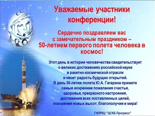 «Ваша встреча, объединившая представителей легендарного отряда космонавтов, известных ученых, исследователей, руководителей органов государственной власти, зарубежных гостей - приурочена к юбилею первого полета человека в Космос. 50 лет назад Юрий Алексеевич Гагарин преодолел не только силу земного притяжения, но и все трудности, стоявшие на пути первых покорителей Вселенной, и своим беспримерным подвигом предопределил статус нашей страны как великой космической державы.