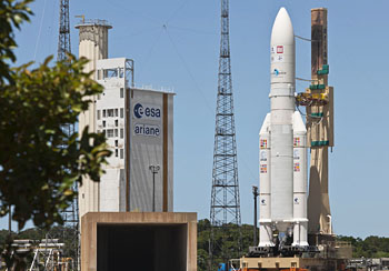 The workhorse Ariane 5 for tomorrow's evening mission from French Guiana is now ready for liftoff following its rollout to the Spaceport's ELA-3 launch complex this afternoon.