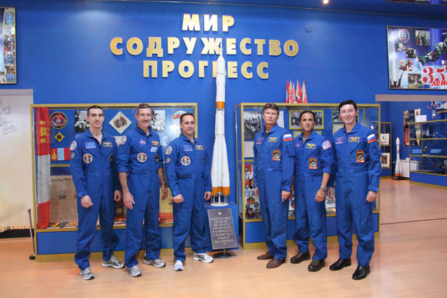 At the Baikonur Cosmodrome in Kazakhstan, the Expedition 30 prime and backup crews toured the Korolev Museum Nov. 9, 2011 and pose for pictures around a model of a Soyuz rocket as they prepared for the launch on the Soyuz TMA-22 spacecraft from Baikonur to the International Space Station. From left to right are the prime crew that are scheduled to launch Nov. 14, Flight Engineer Anatoly Ivanishin, Expedition 30 Commander Dan Burbank of NASA and Soyuz Commander Anton Shkaplerov and the backup crew members, Gennady Padalka, Joe Acaba of NASA and Sergei Revin.