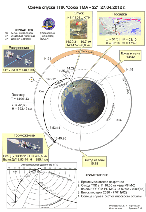 ЦитироватьПо предварительным расчётам баллистической службы Центра управления полётами ЦНИИмаш расстыковка корабля «Союз ТМА-22» с МКС планируется завтра, 27 апреля, в 12 часов 18 минут по московскому времени (09:18 GMT). Приземление спускаемого аппарата корабля ожидается в 15 часов 45 минут 06 секунд (12:45:06 GMT) в 88 километрах северо-восточнее города Аркалык в Казахстане.