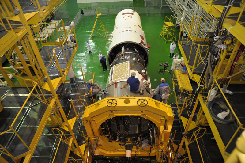 В течение дня на площадке 112 космодрома проходила общая сборка ракеты  космического назначения. Все запланированные операции успешно завершены, собранная ракета-носитель с пристыкованной головной частью находится на транспортно-установочном агрегате. Ведется поддержание необходимого температурного режима.