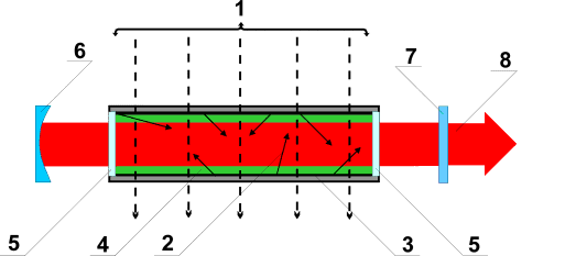 Схема Лазерно-активного элемента: 1 - поток нейтронов; 2 - осколки делений; 3 - слой U235; 4 - лазерно-активная среда; 5 - оптические окна; 6 - "глухое" зеркало; 7 - выходное зеркало; 8 - лазерный пучок.