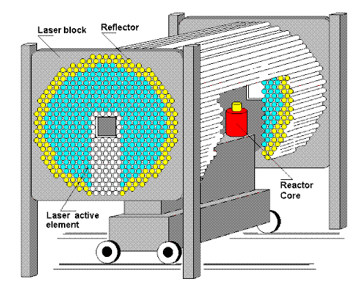 Нейтроны из запального реактора, проходя через лазерно-активный элемент (ЛАЭЛ), вызывают деления урана-235, нанесенного на внутреннюю поверхность ЛАЭЛа. Осколки деления, попадая в лазерно-активную среду, создают рекомбинационно неравновесную ядерно-возбуждаемую плазму и инверсию лазерных уровней. Запасенную в среде энергию можно вывести из лазерно-активного элемента с помощью специальной оптической системы, состоящей из "глухого" и выходного зеркал (т.н. "лазерный генератор с ядерной накачкой").