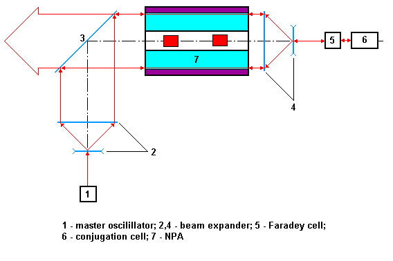 ОКУЯН функционирует следующим образом. Нейтроны, рожденные в импульсном запальном реакторе, проходя через лазерный блок, замедляются в нем и вызывают деления урана-235 в лазерно-активных элементах. Осколки деления создают рекомбинационно неравновесную ядерно-возбуждаемую плазму в объеме лазерно-активной среды. Запасенную в лазерно-активной среде энергию можно вывести из ЛАЭЛов используя специальную оптическую систему. На данной установке предполагается использовать схему "задающий генератор - двухпроходовый усилитель" (см. Рис.). В качестве задающего генератора будет использован лазер с накачкой электронным пучком.