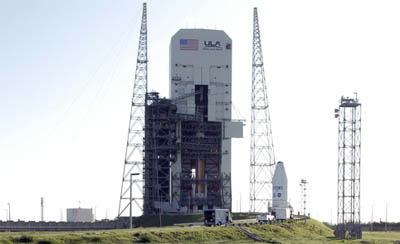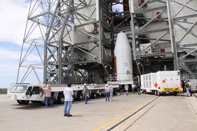 A motorized trailer then carried the 3,400-pound satellite up the road to Complex 37 early Monday. It was positioned on the oceanside of the mobile service gantry and hoisted into the pad tower for bolting to the rocket's second stage.