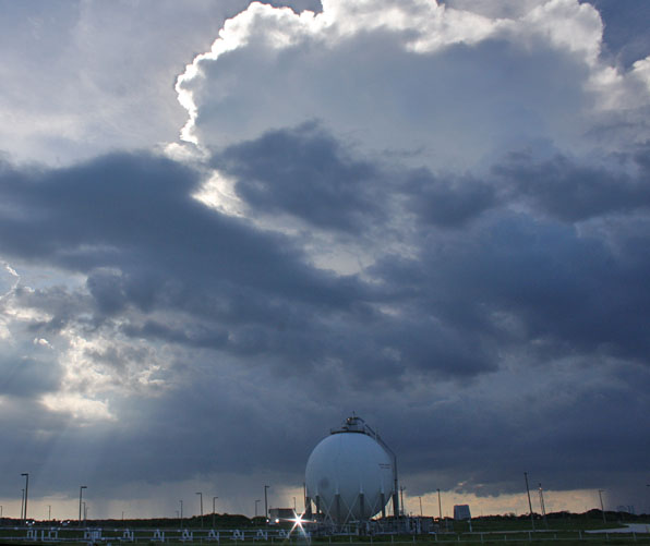 Complex 37 has two giant sphere-shaped fuel tanks to store the cryogenic liquid oxygen and liquid hydrogen. The LOX tank holds 250,000 gallons and LH2 sphere about 850,000 gallons.