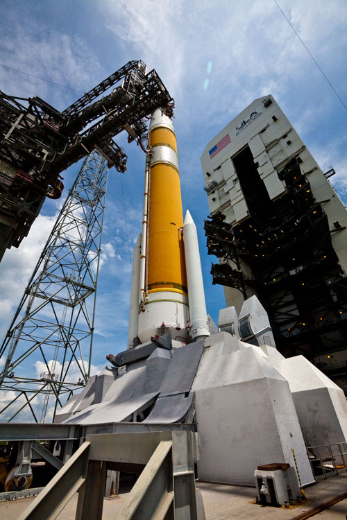 File image shows satellite payload pulling up to Delta's pad. Credit: NASA