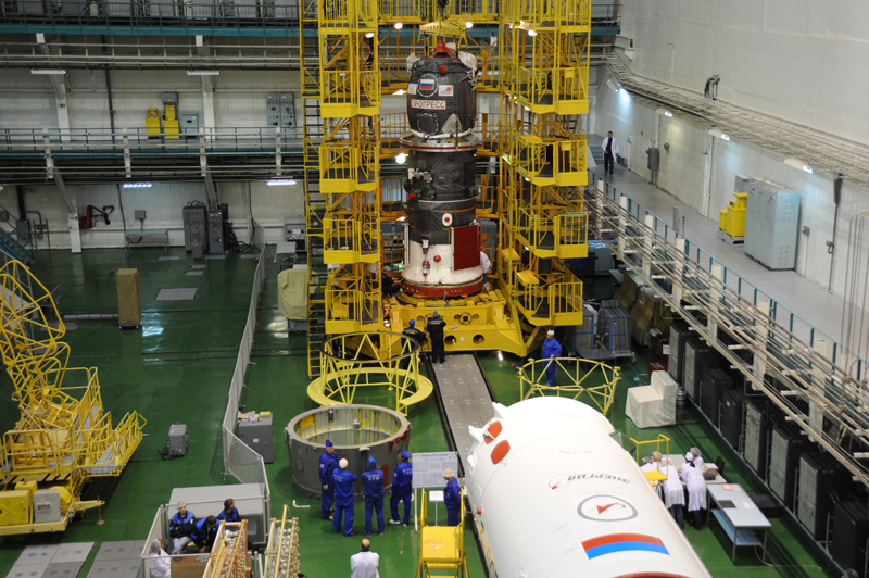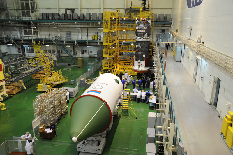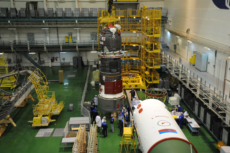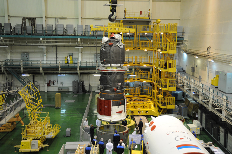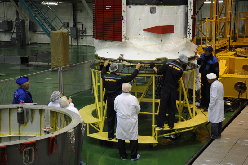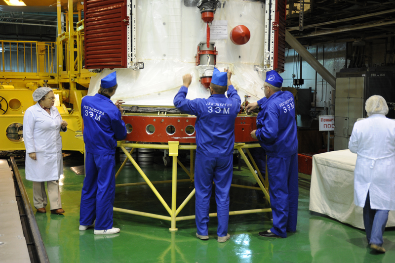 Сегодня в монтажно-испытательном корпусе площадки 254 космодрома началась сборка космической головной части – грузовой корабль устанавливается на переходный отсек. После завершения монтажных работ транспортный грузовой корабль вновь будет возвращён в стенд и для подготовки к установке на него головного обтекателя («накатке»). После завершения сборки космическая головная часть будет перевезена на площадку 112 космодрома, где пройдет ее стыковка с ракетой-носителем (РН) «Союз-У».