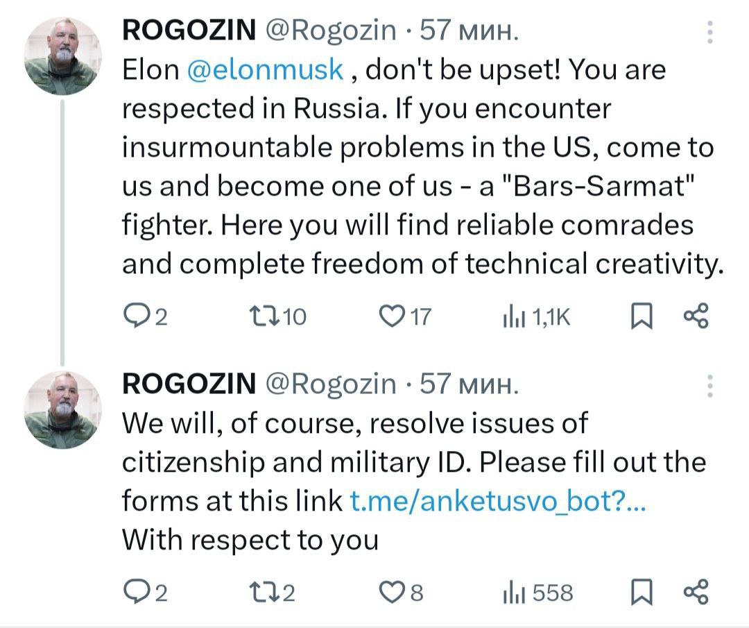 Маску заключить контракт с МО РФ можно предложить, а, вот, российским мультипаспортным олигархам-миллиардерам, богатеющим на СВО, такого предложения от Рогозина не было сделано. Как и главам мигрантских диаспор по всей стране. Наверное, потому, что из кресла сенатора катапультироваться можно быстрее, чем на батуте до кресла сенатора  допрыгнуть. Да и американского владельца красноярских активов никто такими предложениями не беспокоит.