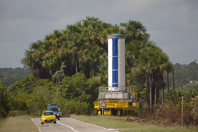 Vega came to French Guiana aboard the MN Colibri roll-on/roll-off ship, which docked yesterday at Kourou's Pariacabo Port after a two-week Atlantic crossing from Europe, and was unloaded this morning for the launcher's transfer by road to the Spaceport.
