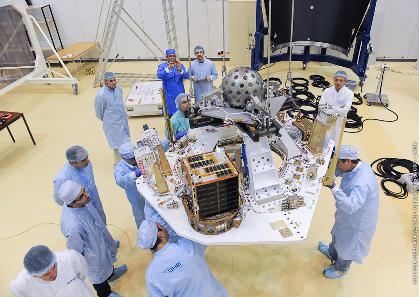 After LARES is deployed during Vega's inaugural flight, the launcher's AVUM fourth stage will then perform a maneuver lowering its perigee to 350 km. before deploying the eight other satellites.  The largest of these is ALMASat-1 (the ALma MAter SATellite), a 12.5-kg. technology demonstrator microsatellite developed and built by the University of Bologne.  Its launch will test the performance of this low-cost, multipurpose 30-cm. platform to prepare for future missions in technology demonstration applications or Earth observation.