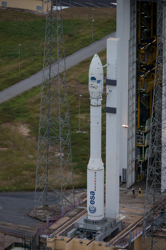 The 98-foot-tall booster is due for liftoff in a two-hour launch window opening at 1000 GMT (5 a.m. EST) Monday. The four-stage launcher, developed with Italian leadership, will make its first flight from the Guiana Space Center, a European-run spaceport in French Guiana.