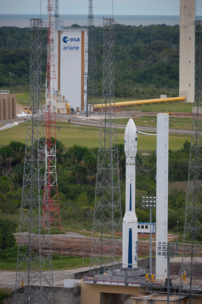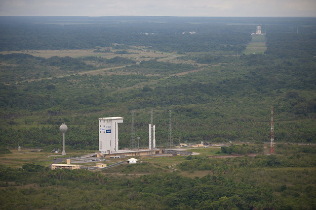 The mobile service gantry, which stands 16 stories tall, is retracted about 260 feet away from the Vega rocket at the ZLV launch complex at the Guiana Space Center.