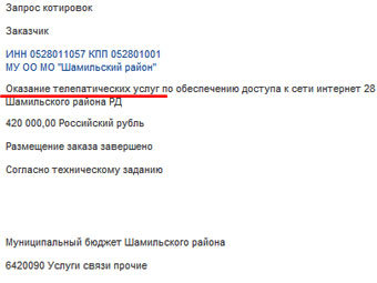 Заказ разместил отдел образования администрации Шамильского района Дагестана. Телепатические услуги потребовались муниципальным чиновникам для того, чтобы провести интернет в 28 образовательных учреждений.