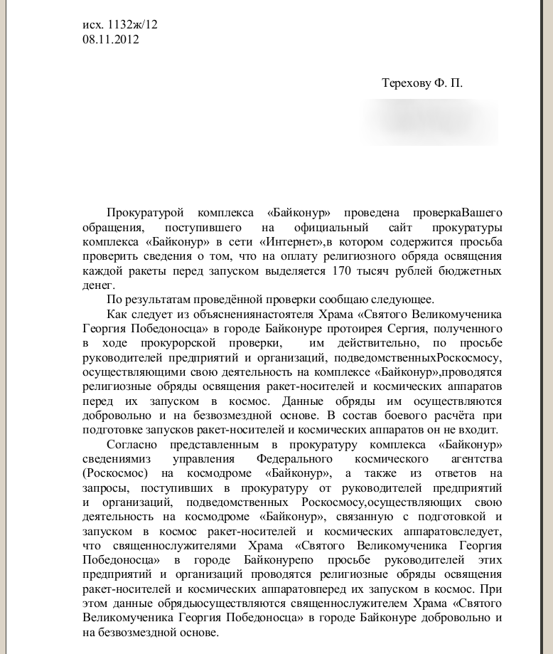 Из бюджетных денег платить священникам было бы сверхнаглостью. ОАО Энергия может и небюджетными проплатить. Осталось выяснить, как в 2004 году священники стали Заслуженными испытателями космической техники РФ, если даже в состав расчета пуска не входят? Освящение экипажей в гостинице прокурор обошел. Не тут ли платят?