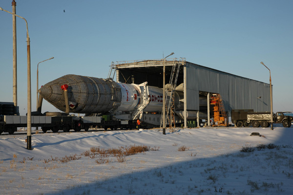 На площадке 92-50 космодрома в монтажно-испытательном корпусе проводится перевозка комической головной части (разгонный блок «Бриз-М» с пристыкованным к нему космическим аппаратом «NSS-14» под головным обтекателем) из зала испытаний в зал сборки с ракетой-носителем. Затем головная часть будет выгружена с платформы и пристыкована к ракете-носителю.