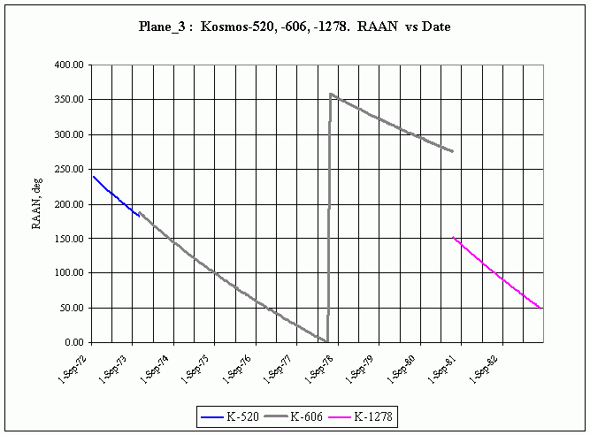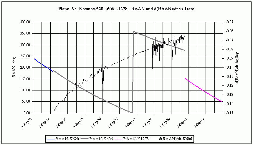 Если Космос-520 и Космос-606 можно отнести к одной плоскости, то Космос-1278 явно в нее не попадает (разность ДВУ - 126 градусов, как это следует из разрыва на графике  в июне 1981 г.). Остальные плоскости я не смотрел.