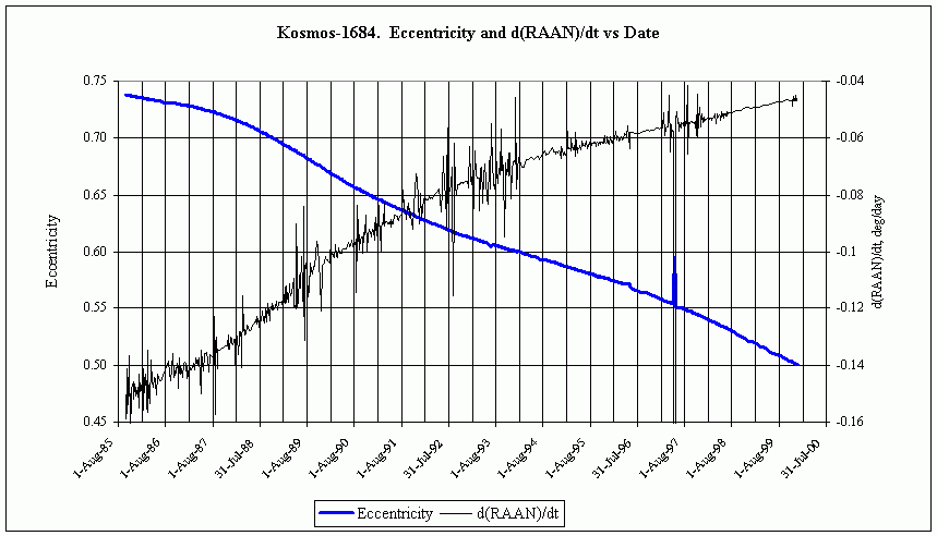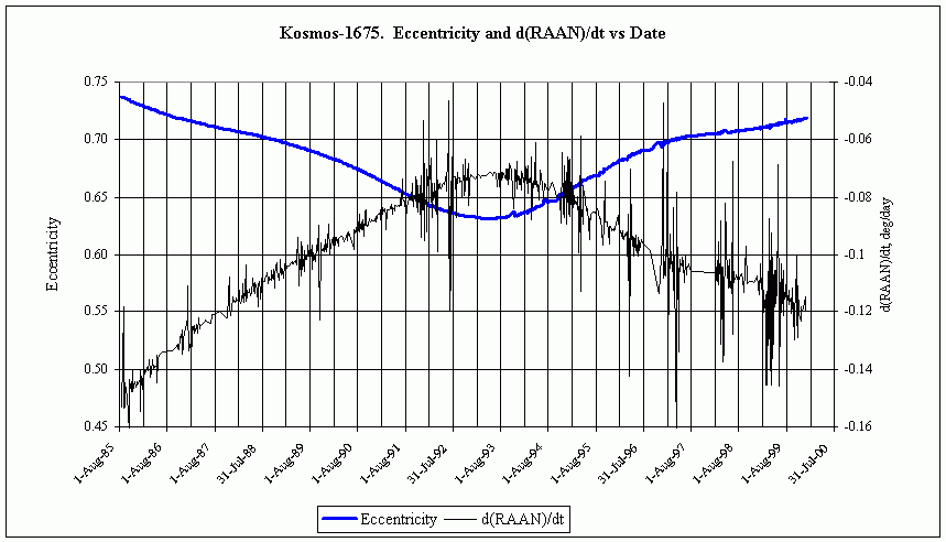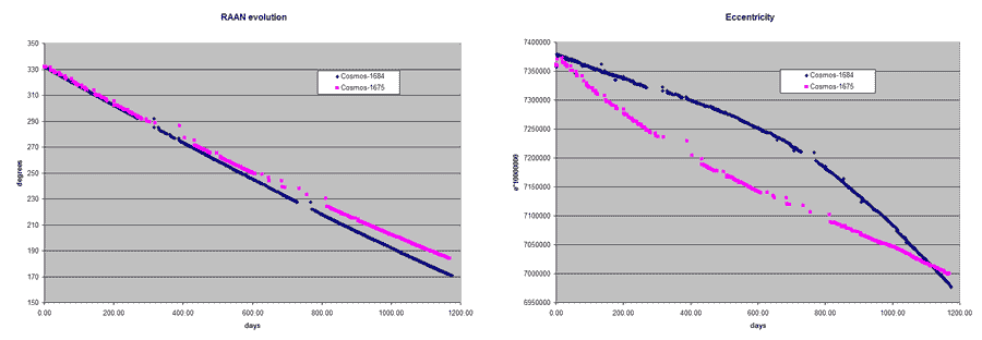 Наверняка утверждать не возьмусь, поскольку эволюция орбит этих спутников довольно сложная и все зависит от всего. Но дело, возможно, вовсе не в эксцентриситете. Вот данные для Космоса-1675 и Космоса-1684 (я постарался выбрать максимально похожие - К-606 сложно с чем-то сравнивать корректно; ДВУ приведены к одному начальному значению, чтобы было видно относительное поведение):