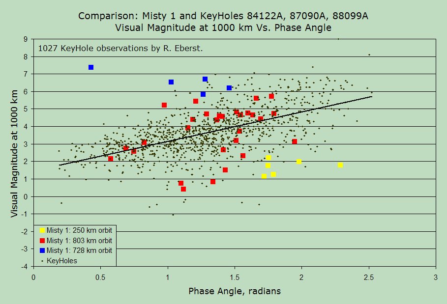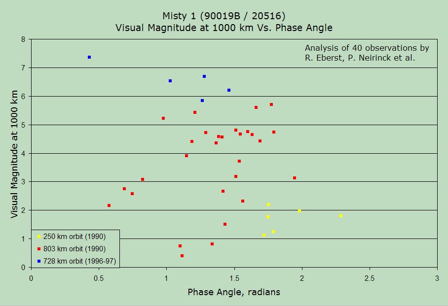 The blue symbols denote observations of Misty 1 in its 66.2 deg inclination, 728 km orbit. Russell Eberst made all five observations during 1996-97, which he reported as three different unknowns, and which I identified in 2000.