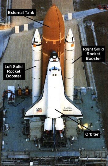 Слева разорвавшийся не выдержав нагрузок твёрдотопливный ускоритель. А бак гордо возвышается НАД Шаттлом. Сверху над Шаттлом кислород, а ниже на уровне носа Шаттла и ниже - водород.