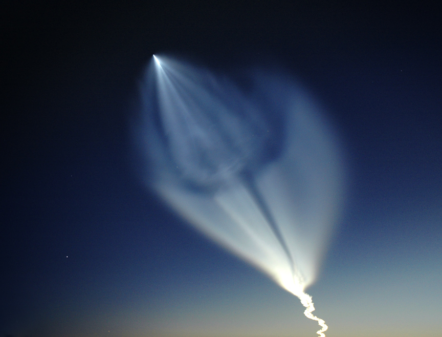 ЦитироватьМожет, это летящая по инерции 3ст. после отказа двигателя? Потому и видно слабенько - нет собственного свечения факела и отраженного свечения газового следа.