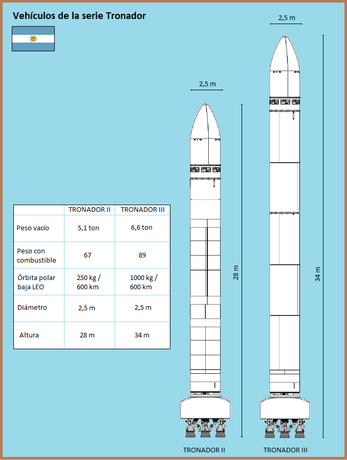 Разрабатывается  проект Tronador II, целью которого является прототип ракеты для вывода на полярную орбиту высотой 600 км спутника массой 250 кг в  2017-2018 году.